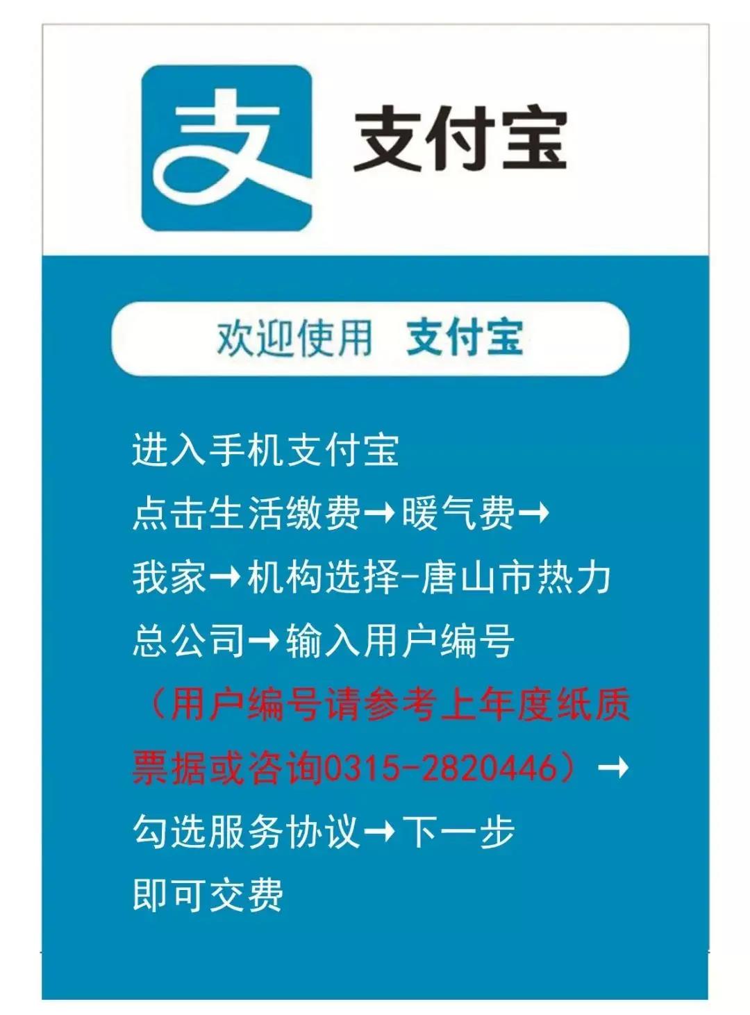 温馨提示2、通过热力微信公众号、支付宝、微信钱包、银行电子渠道支付的交费时间:对于往年无陈欠热费的直管居民热用户均支持全天24小时交费服务;通过银行电子渠道、热力微信公众号、微信钱包、支付宝支付交费需要的“用户编号”,可在上年度纸质票据票面上查找,也可通过拨打0315-2820446进行人工咨询。