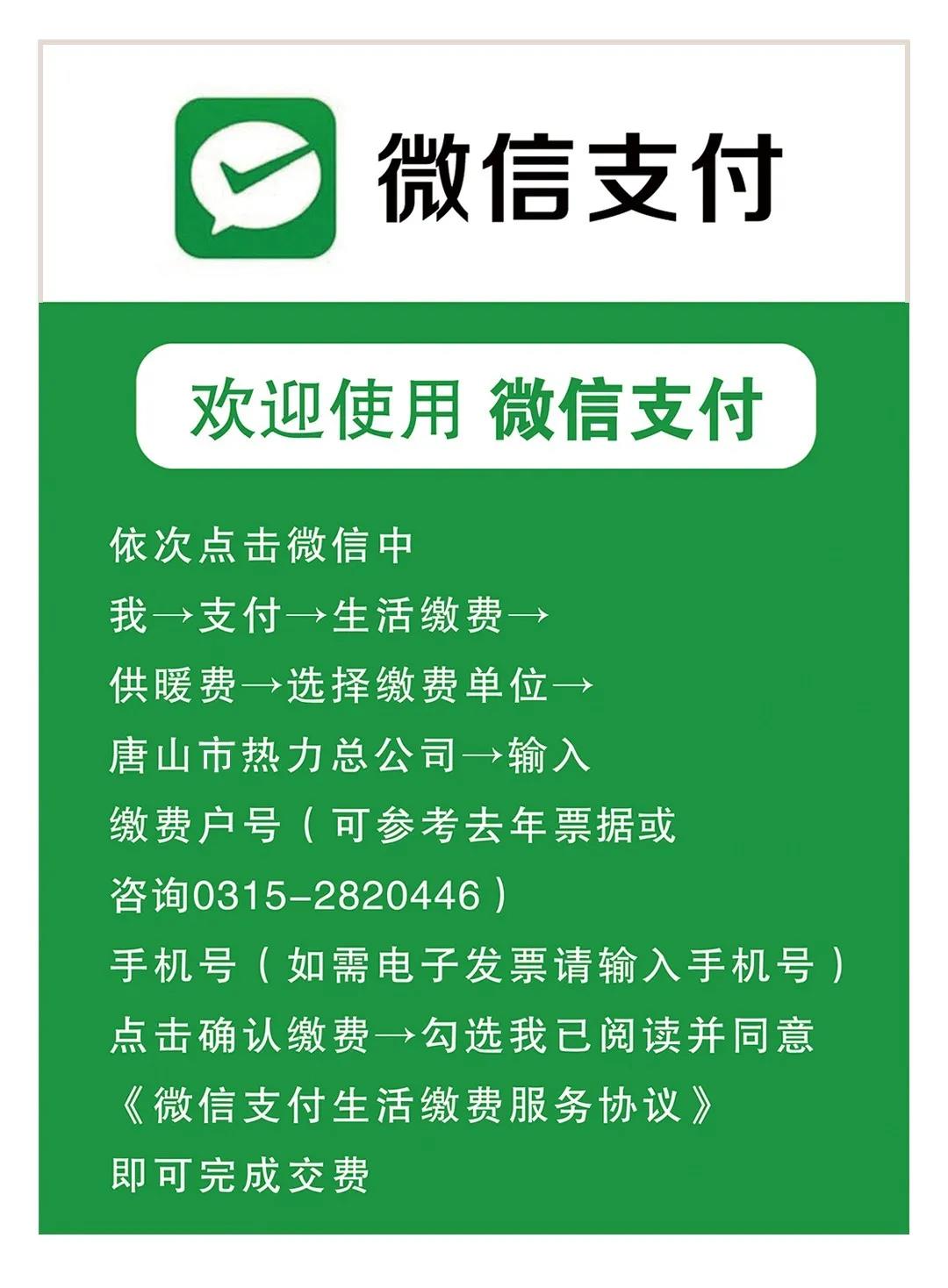 温馨提示3、通过热力微信公众号、支付宝、微信钱包、银行电子渠道支付交费尚存区域和条件限制:通过银行电子渠道、热力微信公众号、微信钱包、支付宝支付交费的,仅限于唐山市热力总公司供热所管辖范围内(华烨公司管辖服务范围内的热用户可以选择支付宝、微信钱包、河北银行手机APP方式交纳)往年无陈欠热费的直管居民热用户,暂不支持公建单位、底商、代收代缴区域的居民用户。