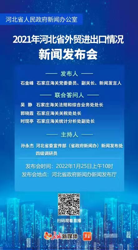 1月25日(周二)上午10时,省政府新闻办召开 “2021年河北省外贸进出口情况”新闻发布会。石家庄海关负责同志发布,相关处室负责同志回答记者提问。