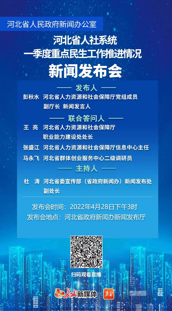 4月28日(星期四)下午15时,省政府新闻办召开“河北省人社系统一季度重点民生工作推进情况”新闻发布会。河北省人力资源和社会保障厅负责同志发布,相关处室负责同志回答记者提问。