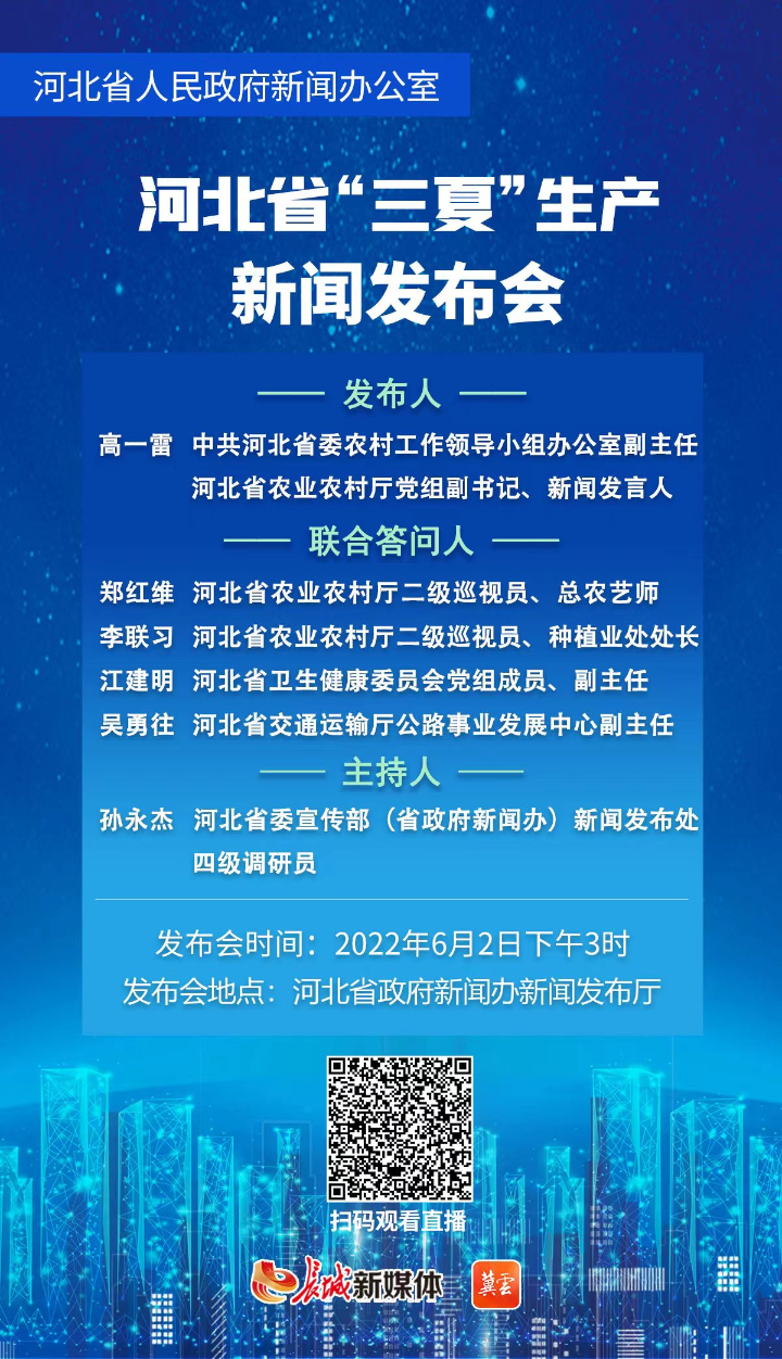 6月2日(星期四)下午15时,省政府新闻办召开“河北省‘三夏’工作”新闻发布会,省农业农村厅负责同志发布;省农业农村厅、省卫健委、省交通运输厅分管负责同志回答记者提问。