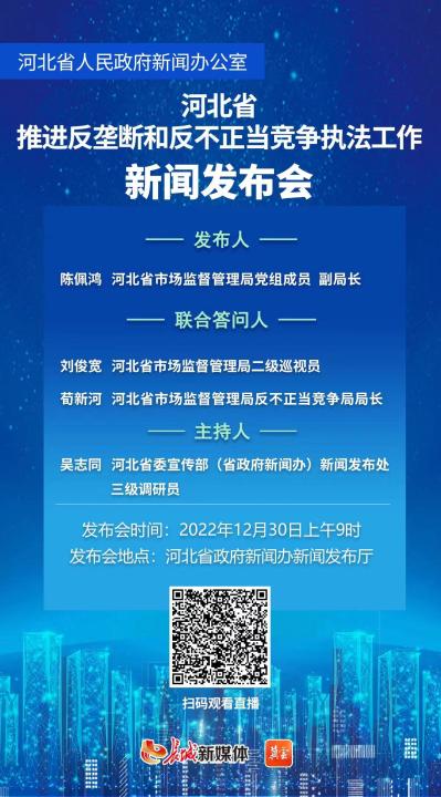 12月30日(星期五)9时,省政府新闻办召开“河北省推进反垄断和反不正当竞争执法工作”新闻发布会。河北省市场监督管理局负责同志发布,相关负责同志回答记者提问。