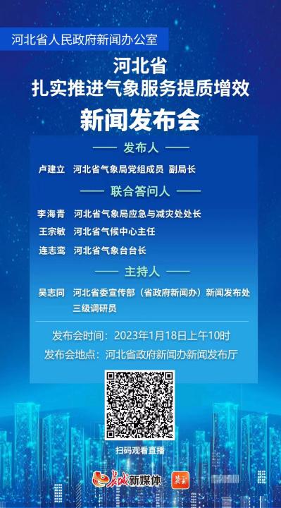 2023年1月18日(星期三)10时,省政府新闻办召开“河北省扎实推进气象服务提质增效”新闻发布会。河北省气象局负责同志发布,相关处室负责同志回答记者提问。