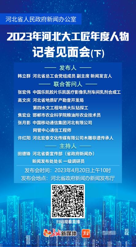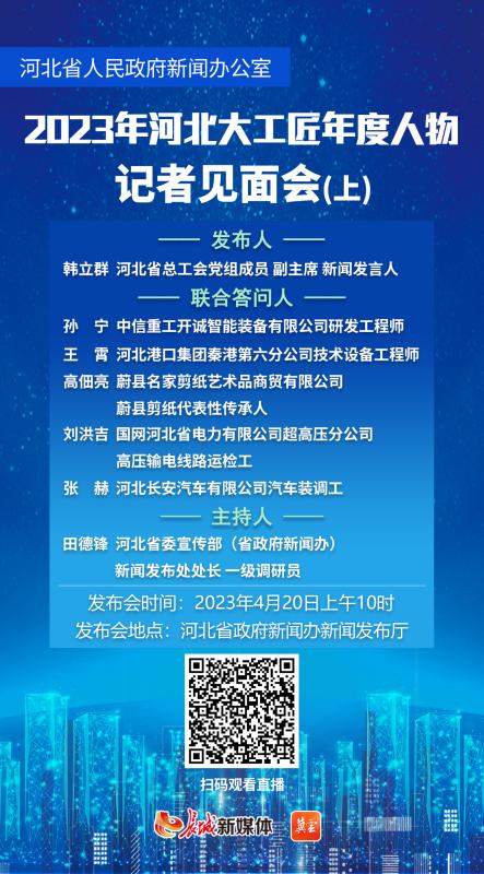 4月20日(星期四)上午10时,省政府新闻办召开“2023年河北大工匠年度人物”记者见面会。河北省总工会负责同志发布,河北大工匠年度人物和大家见面并回答记者提问。