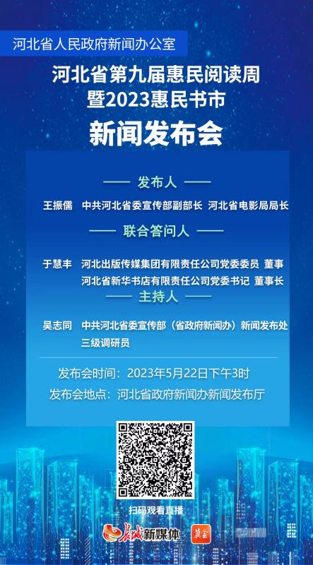 5月22日(星期一)15时,省政府新闻办召开“河北省第九届惠民阅读周暨2023惠民书市”新闻发布会。省委宣传部负责同志发布,并与河北出版传媒集团负责同志共同回答记者提问。