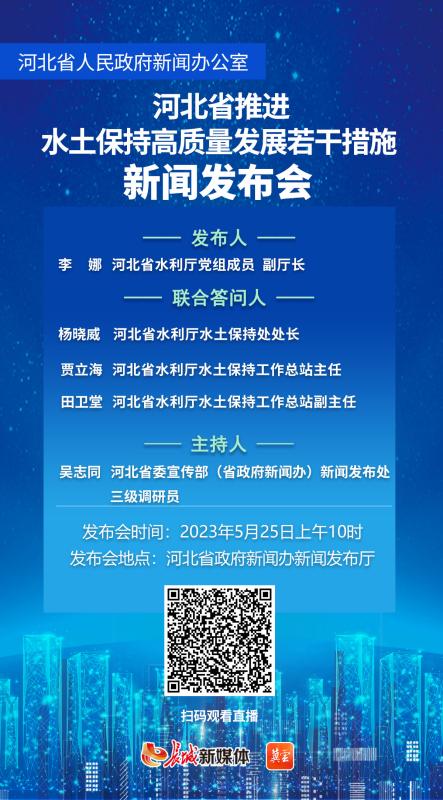 5月25日(星期四)10时,省政府新闻办召开“河北省推进水土保持高质量发展若干措施”新闻发布会。省水利厅负责同志发布,并与相关处室负责同志共同回答记者提问。