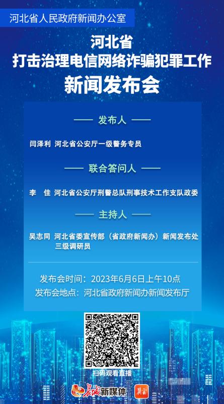 6月6日(星期二)10时,省政府新闻办召开“河北省打击治理电信网络诈骗犯罪工作”新闻发布会。省公安厅负责同志发布,并与相关处室负责同志共同回答记者提问。