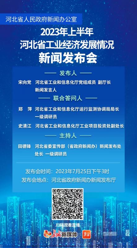7月25日(星期二)15时,召开“2023年上半年河北省工业经济发展情况”新闻发布会。河北省工业和信息化厅负责同志发布,并与该厅相关处室负责同志共同回答记者提问。
