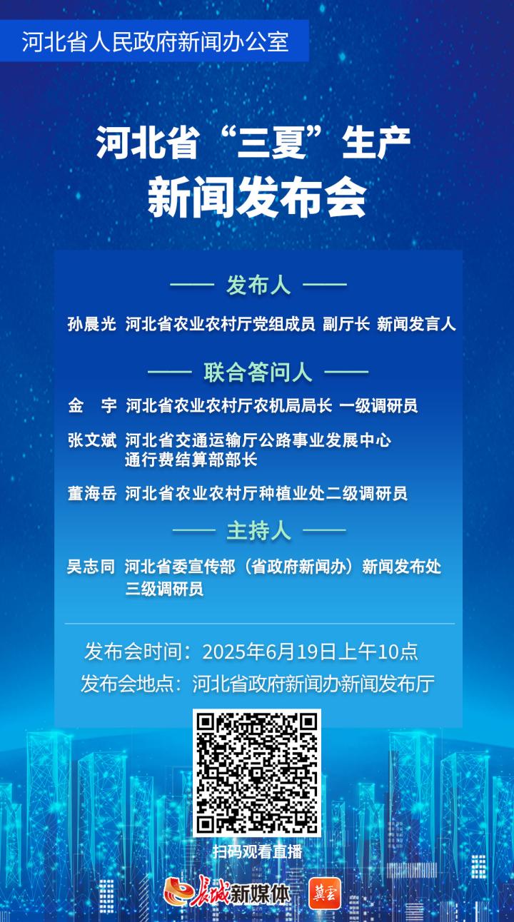 6月19日(星期四)10时,省政府新闻办将召开“河北省‘三夏’生产”新闻发布会。省农业农村厅负责同志发布,并与省交通运输厅、省农业农村厅相关处室负责同志共同回答记者提问。