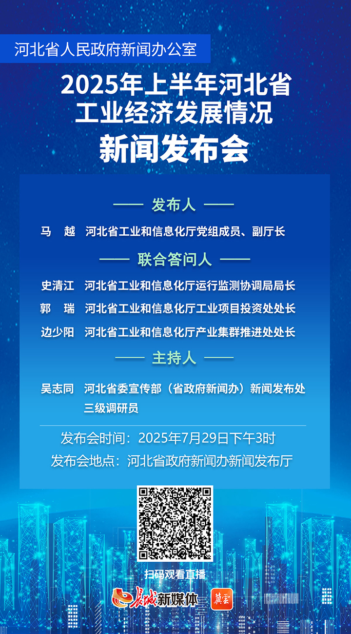 7月29日(星期二)15时,省政府新闻办将召开“2025年上半年河北省工业经济发展情况”新闻发布会。省工信厅负责同志发布,并与省工信厅相关处室负责同志共同回答记者提问。