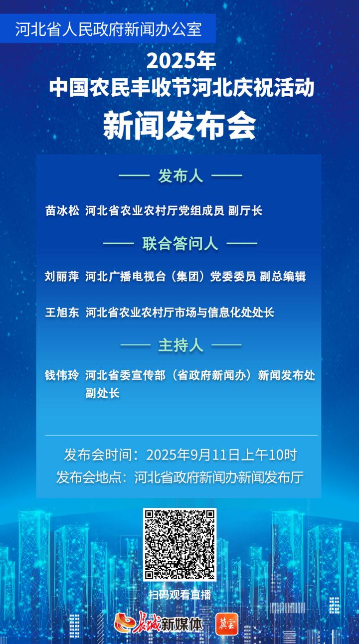 9月11日(星期四)10时,省政府新闻办将召开“2025年中国农民丰收节河北庆祝活动”新闻发布会。河北省农业农村厅负责同志发布,并与河北广播电视台(集团)相关负责同志、省农业农村厅相关处室主要负责同志共同回答记者提问。