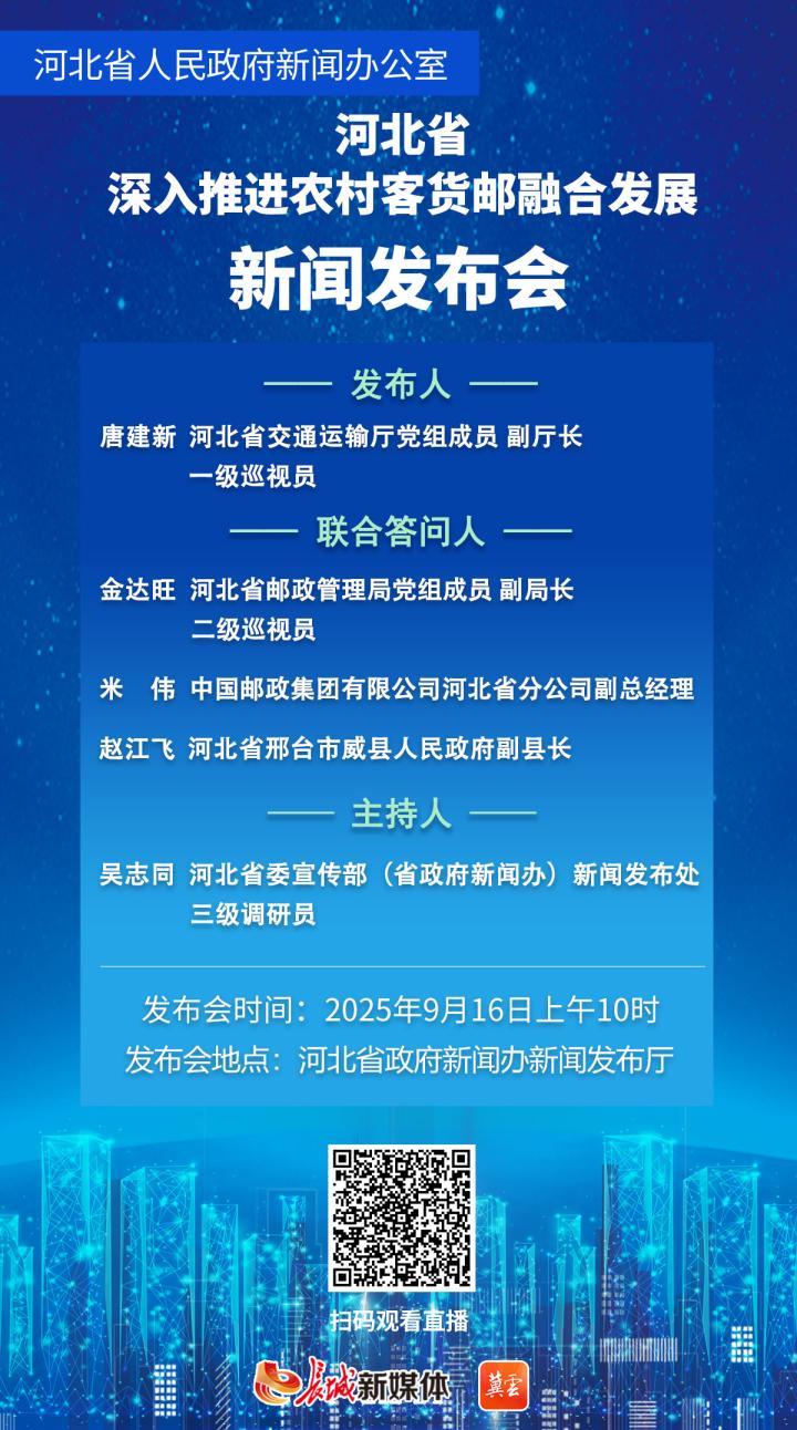 9月16日(星期二)10时,省政府新闻办将召开“河北省深入推进农村客货邮融合发展”新闻发布会。河北省交通运输厅负责同志发布,并与河北省邮政管理局、中国邮政集团有限公司河北省分公司相关负责同志,威县人民政府主要负责同志共同回答记者提问。