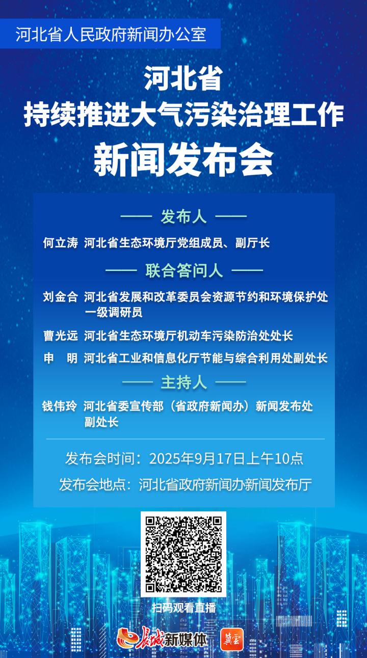 9月17日(星期三)10时,省政府新闻办将召开“河北省持续推进大气污染治理工作”新闻发布会。河北省生态环境厅负责同志发布,并与河北省发展和改革委员会、河北省生态环境厅、河北省工业和信息化厅相关负责同志共同回答记者提问。