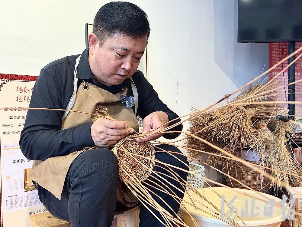 9月12日,张万富在向记者演示讲解固安柳编技艺。河北日报见习记者崔玉洁摄