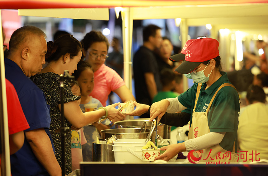石家庄赛场外“足球市集”,络绎不绝的观众排队品尝石家庄特色美食。人民网记者李兆民摄