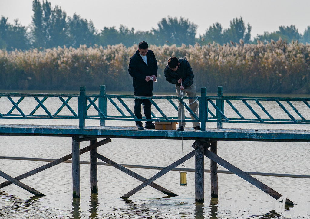 11月4日,曹妃甸湿地和鸟类省级自然保护区管理服务中心工作人员在取水进行水质检测。