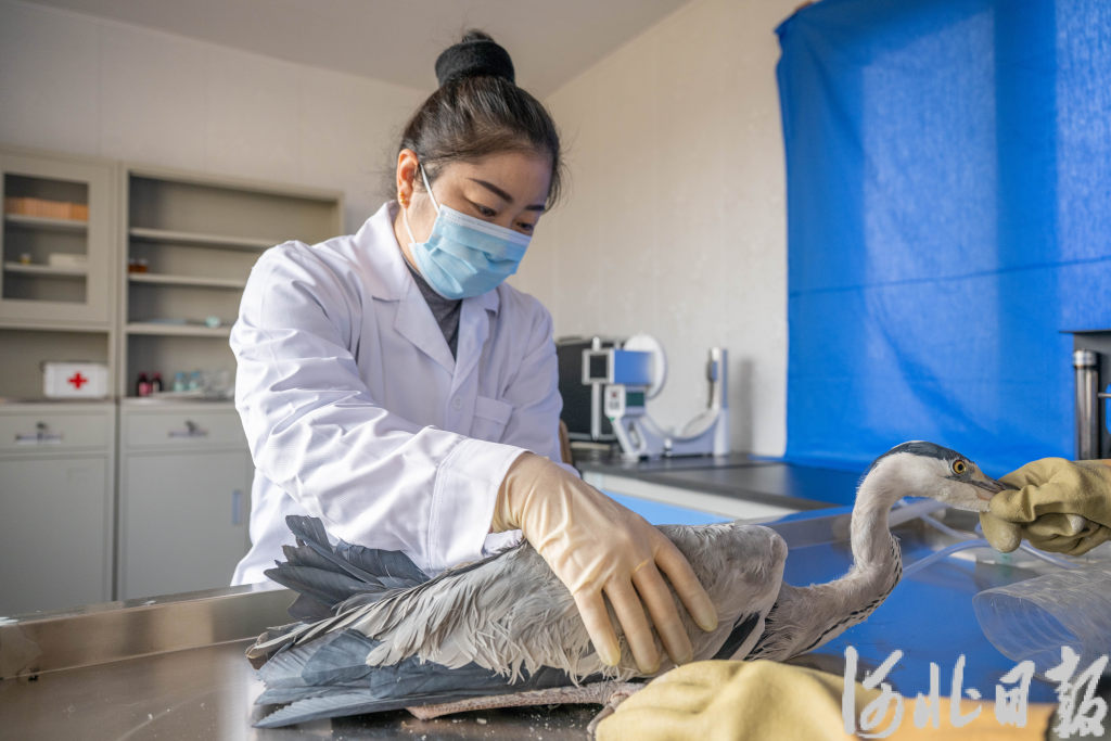 11月4日,曹妃甸野生鸟类救助医院,工作人员为一只苍鹭做体检。