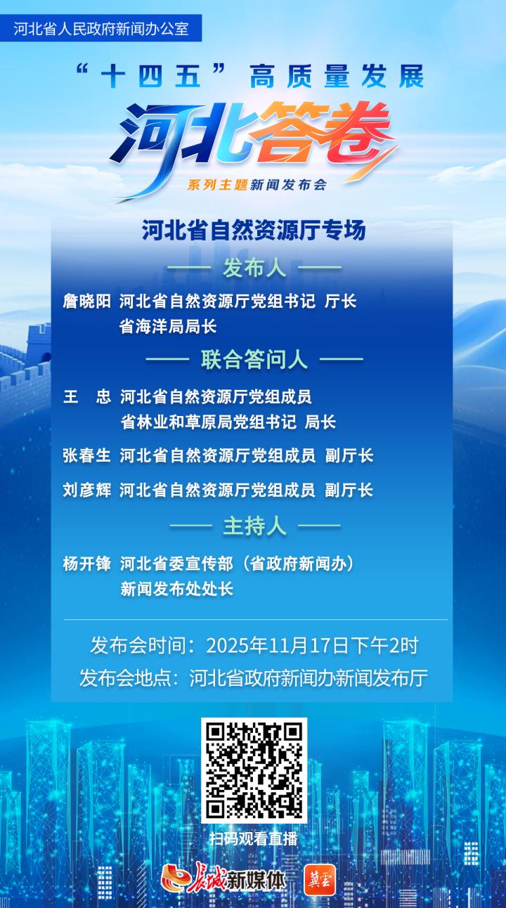 11月17日(星期一)下午14时,河北省政府新闻办将举办“十四五”高质量发展河北答卷系列主题新闻发布会第十一场,邀请省自然资源厅主要负责同志介绍全省“十四五”时期自然资源工作高质量发展成效,并与该厅相关负责同志共同回答记者提问。