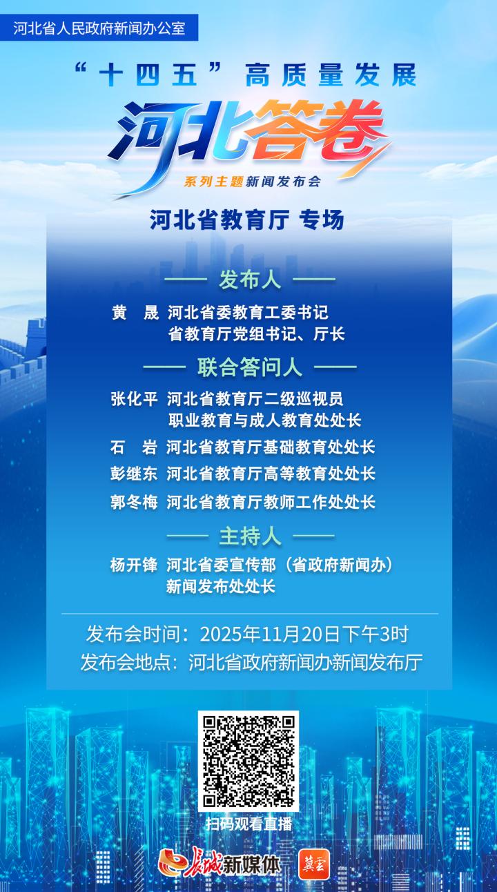 11月20日(星期四)下午15时,河北省政府新闻办将举办“十四五”高质量发展河北答卷系列主题新闻发布会第十二场,邀请省教育厅主要负责同志介绍“十四五”时期河北教育发展成就,并与该厅相关负责同志共同回答记者提问。