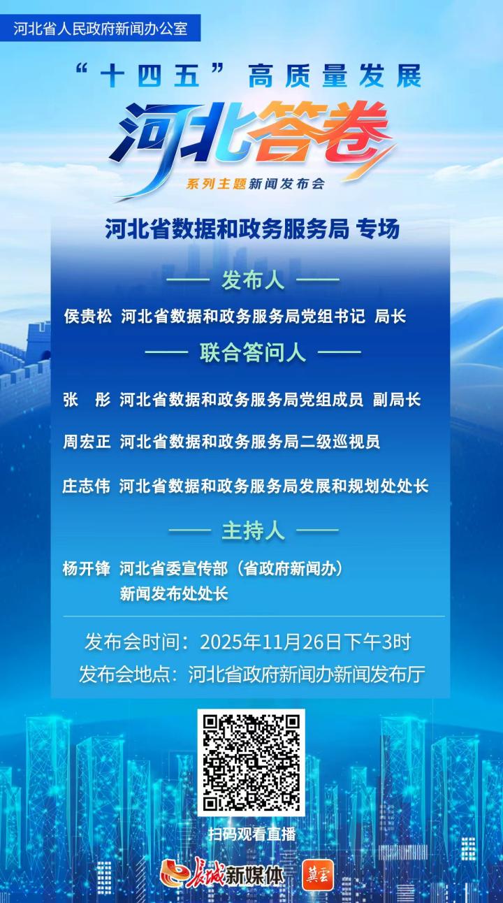 11月26日(星期三)15时,河北省政府新闻办将举办“十四五”高质量发展河北答卷系列主题新闻发布会,邀请省数据和政务服务局主要负责同志介绍“十四五”时期数字河北建设进展成效,并与该单位相关负责同志共同回答记者提问。