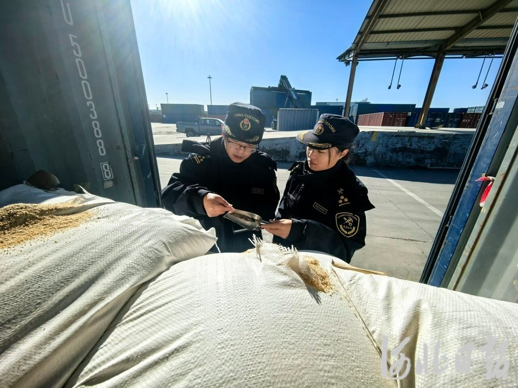 11月18日,石家庄海关所属鹿泉海关关员正在对进口饲用小麦粉进行查验。 河北日报记者 周聪聪摄