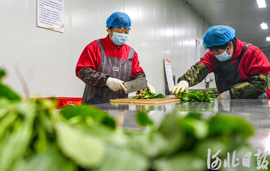 10月29日,在河北农速源冷链物流有限公司净菜加工车间,工人正在切分新鲜的菠菜。河北日报记者李东宇摄