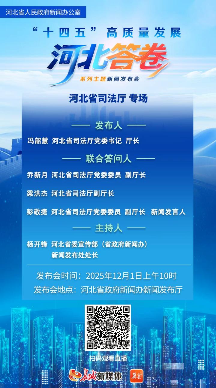 12月1日(星期一)10时,河北省政府新闻办将举办“十四五”高质量发展河北答卷系列主题新闻发布会,邀请省司法厅主要负责同志介绍“十四五”时期司法行政工作情况,并与该单位相关负责同志共同回答记者提问。
