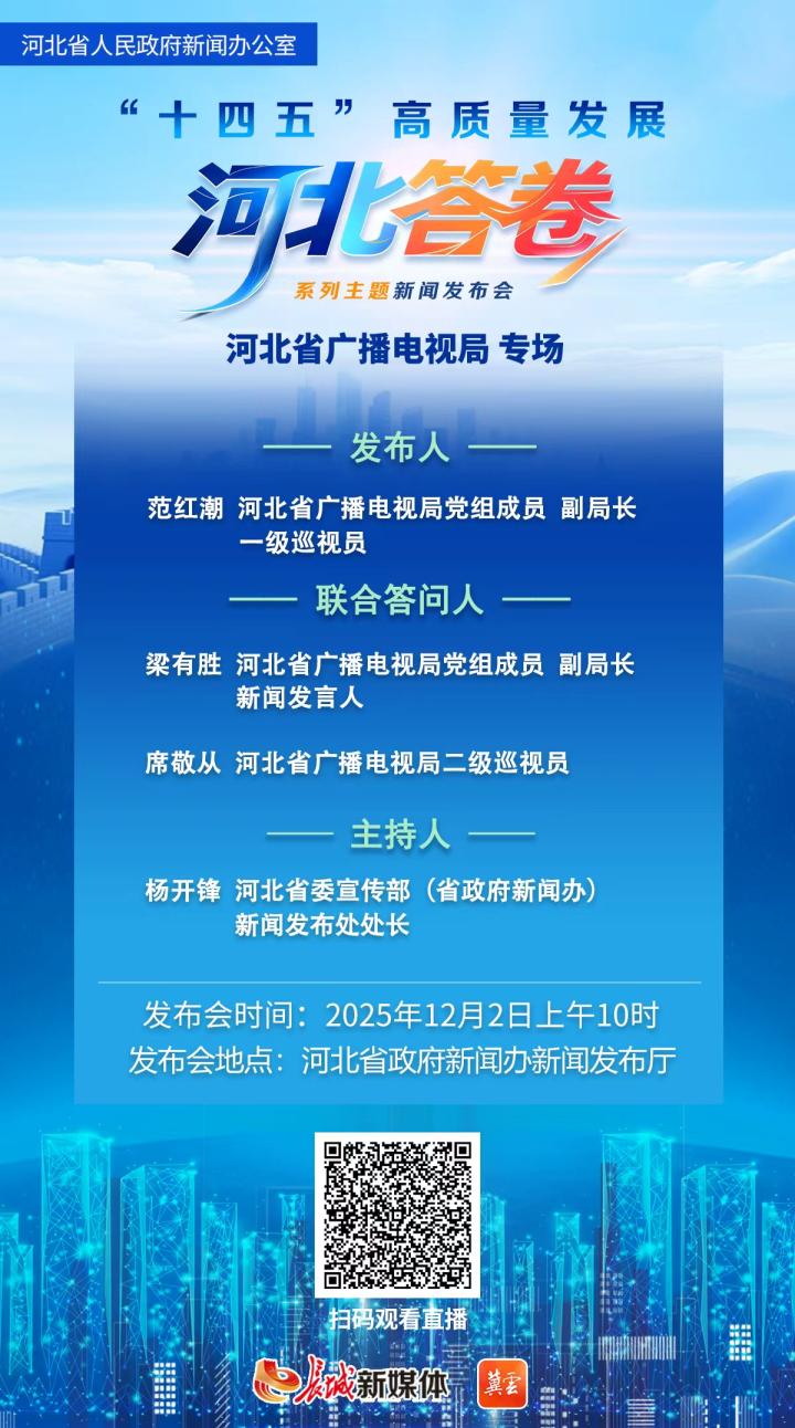 12月2日(星期二)10时,河北省政府新闻办将举办“十四五”高质量发展河北答卷系列主题新闻发布会,邀请省广播电视局负责同志介绍“十四五”时期全省广播电视和网络视听行业发展工作情况,并与该单位相关负责同志共同回答记者提问。