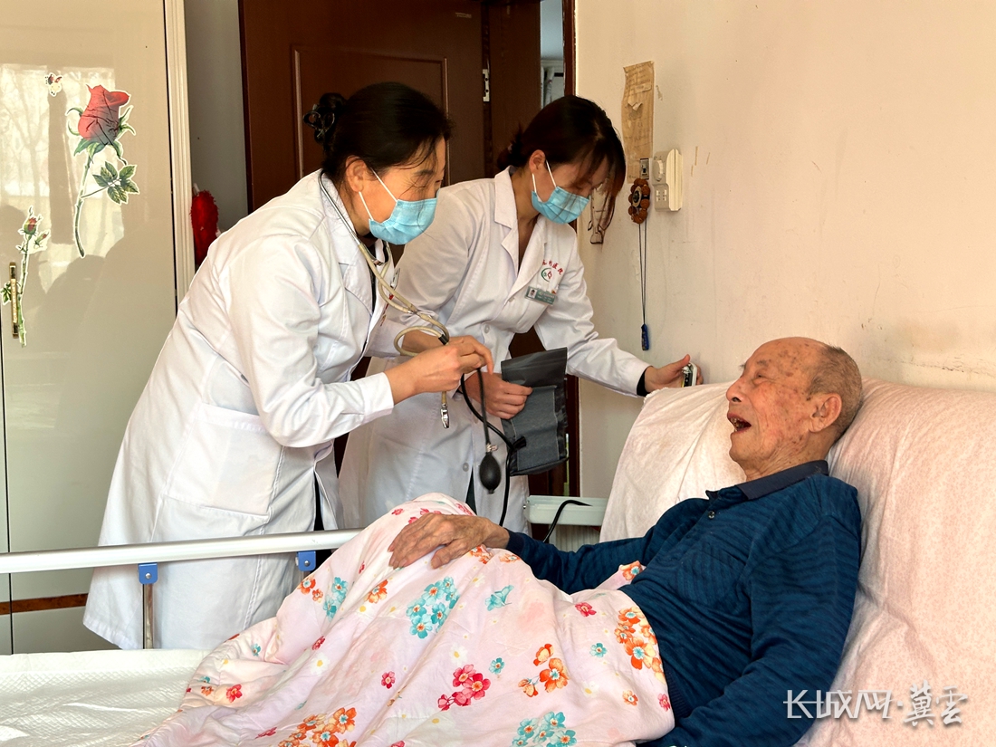 三河东杉医院副院长段小明(左一)到居民家中为行动不便的老人检查身体。通讯员 高澍 摄