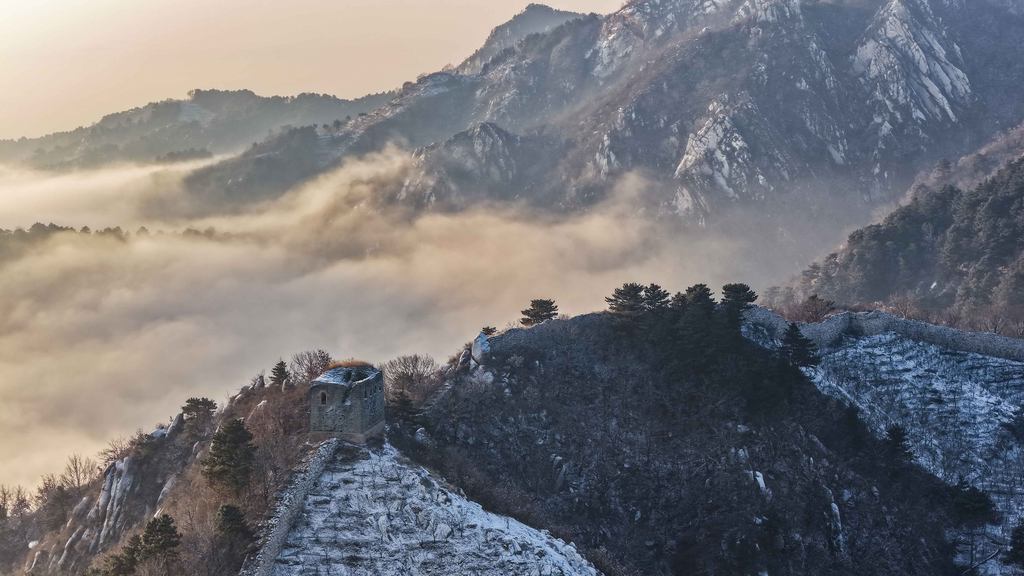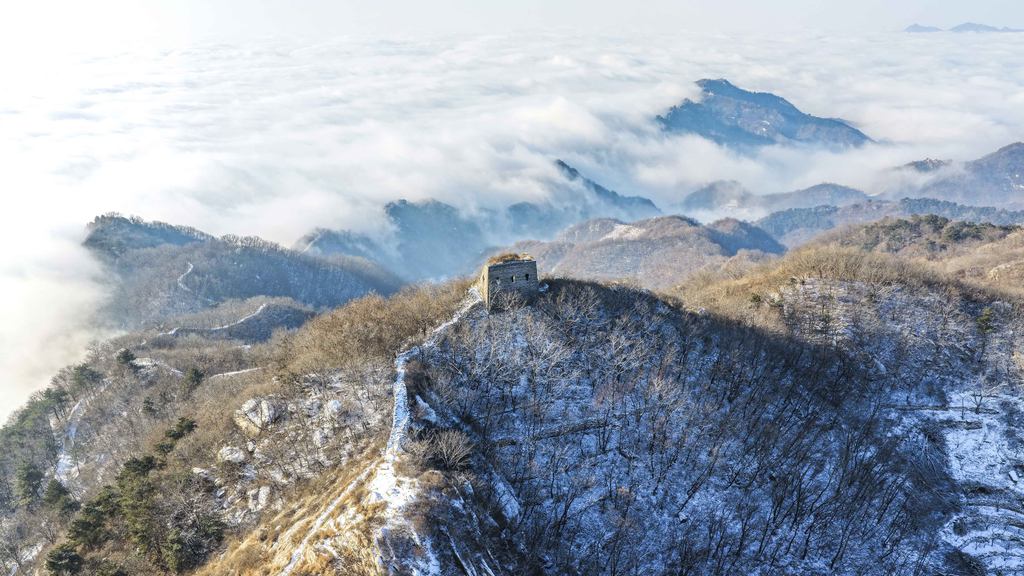 12月23日,无人机在遵化市拍摄的雪后长城。