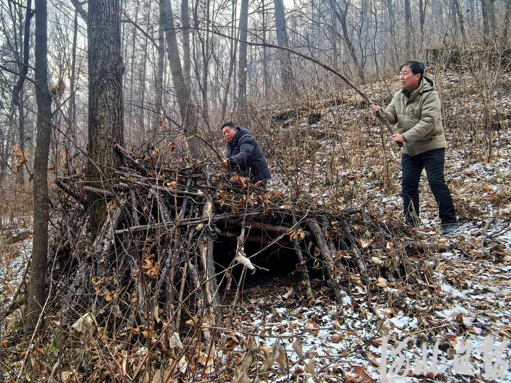 12月19日,河北省木兰围场国有林场新丰分场防火办主任段秀柱(右)正和同事一起为野生动物加固庇护所。河北日报记者陈宝云摄