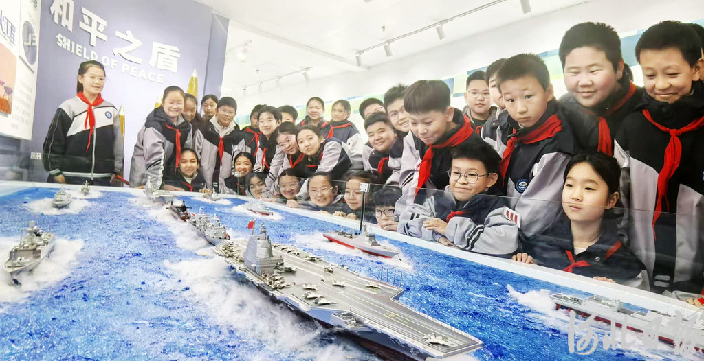在雄安容和乐民小学的国防教育馆内,学生们在航母编队沙盘前上国防教育课。