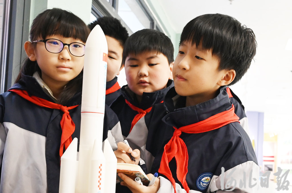 在校园内的国防教育馆,自制的3D打印航天模型作品吸引了学生们的目光。
