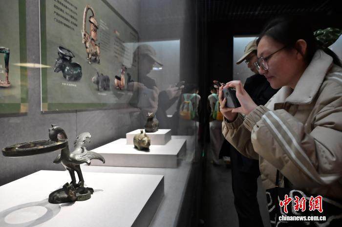 1月2日,位于石家庄的河北博物院“光耀千年——中国古代灯具文化展”现场,参观者记录朱雀铜灯。中新社记者翟羽佳摄