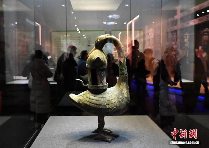 1月2日,位于石家庄的河北博物院“光耀千年——中国古代灯具文化展”现场的雁鱼铜灯。中新社记者翟羽佳摄