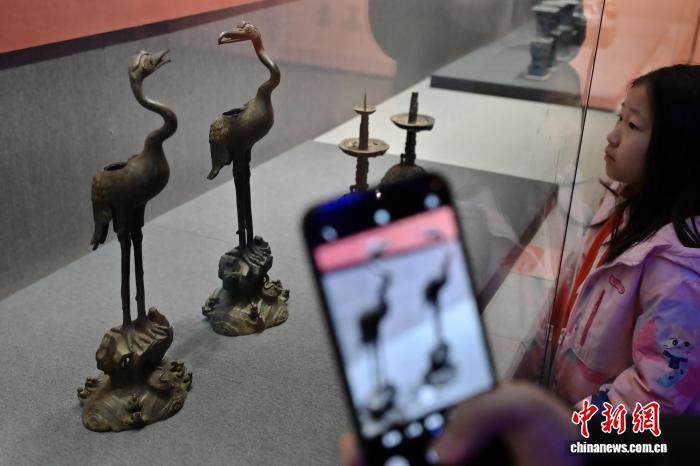 1月2日,位于石家庄的河北博物院“光耀千年——中国古代灯具文化展”现场的仙鹤铜烛台。中新社记者翟羽佳摄