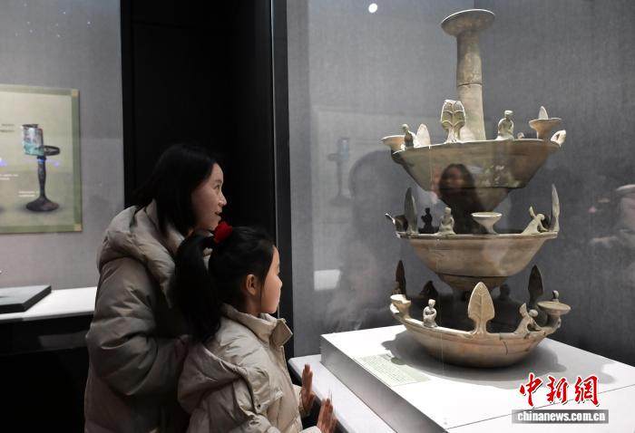 1月2日,位于石家庄的河北博物院“光耀千年——中国古代灯具文化展”现场,参观者观赏彩绘陶灯。中新社记者翟羽佳摄