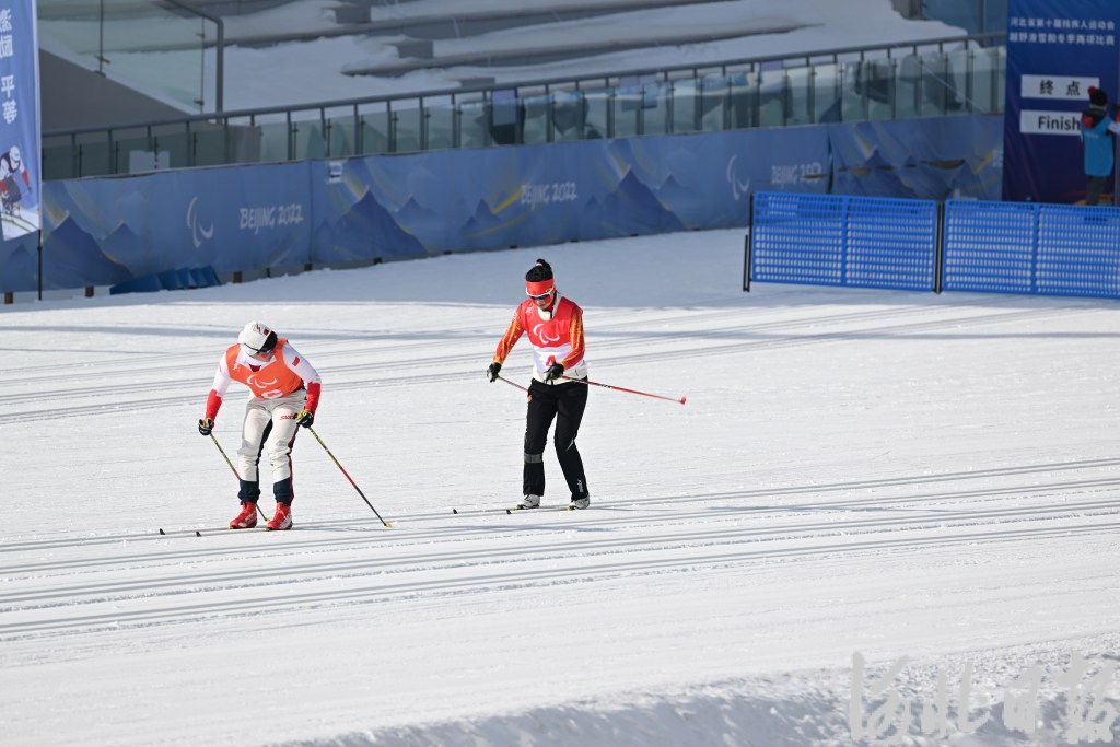图为省残疾人越野滑雪和冬季两项队队员王跃(右)和领滑员李亚林在省第十届残运会暨第六届特奥会比赛中。河北日报资料片