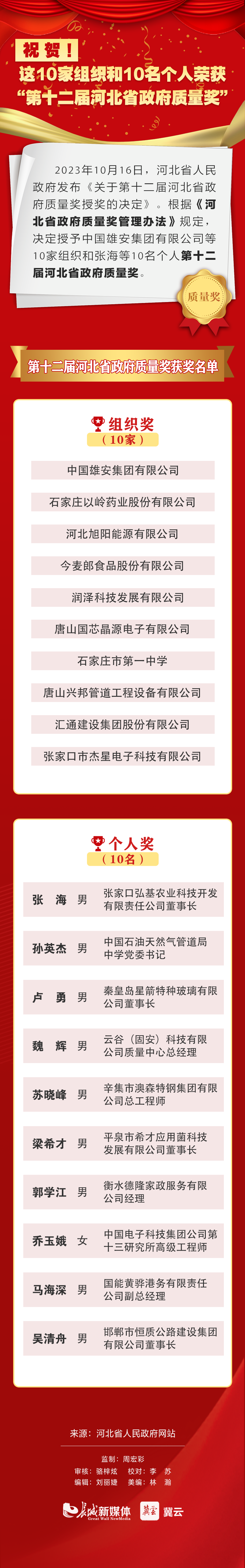 图解 | 祝贺!这10家组织和10名个人荣获“第十二届河北省政府质量奖”