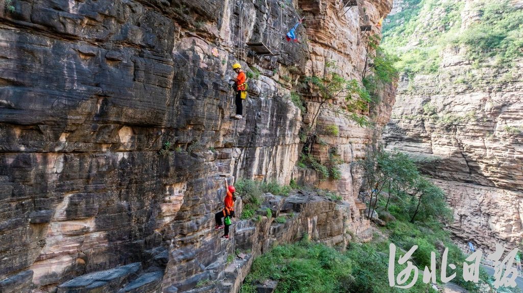 9月24日上午,邢台大峡谷景区陡峭岩壁上,一排排飞拉达索道一字排开,不少游客正紧抓扶手、脚踩踏板,变身“峭壁行者”,一步步向着崖壁上方攀爬。
