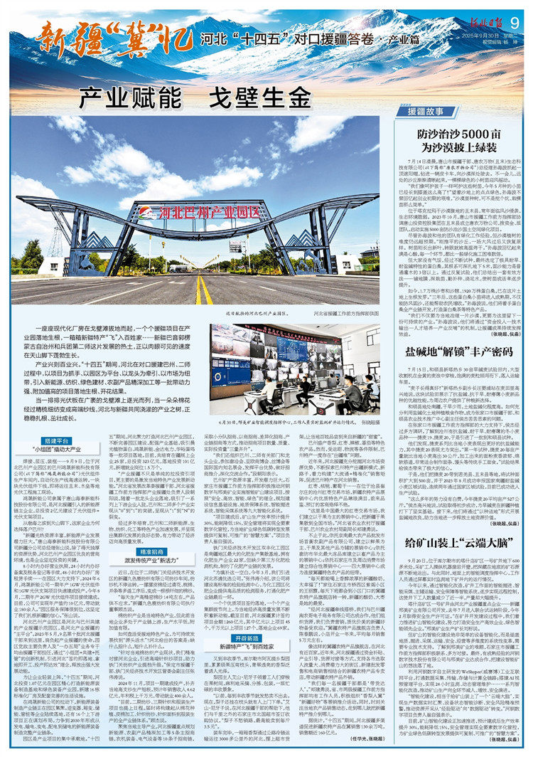 产业兴则百业兴。“十四五”期间,河北在对口援建巴州、二师过程中,以项目为抓手、以园区为平台、以龙头为牵引、以市场为纽带,引入新能源、纺织、绿色建材、农副产品精深加工等一批带动力强、附加值高的项目落地生根、开花结果。
