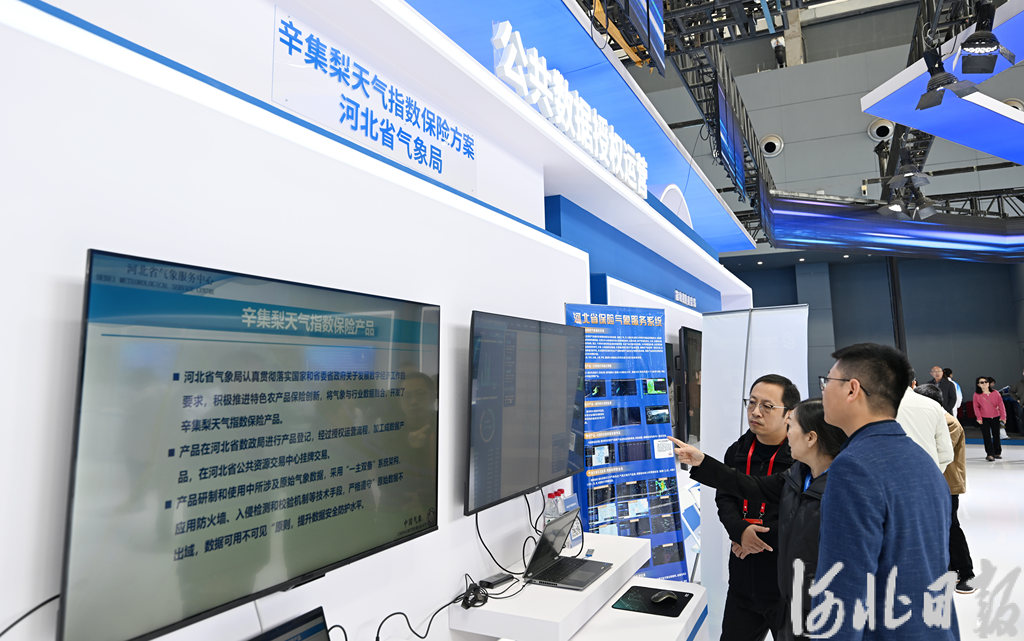 10月18日,在2025中国国际数字经济博览会展区,参观嘉宾现场了解辛集梨天气指数保险产品。 河北日报记者 史晟全摄