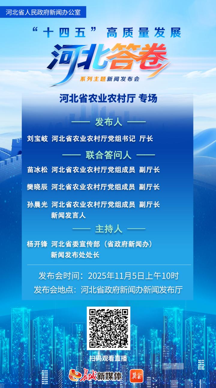 11月5日(星期三)10时,河北省政府新闻办将举办“十四五”高质量发展河北答卷系列主题新闻发布会第四场,邀请省农业农村厅主要负责同志介绍“十四五”时期我省农业农村高质量发展成就,并与该部门相关负责同志共同回答记者提问。