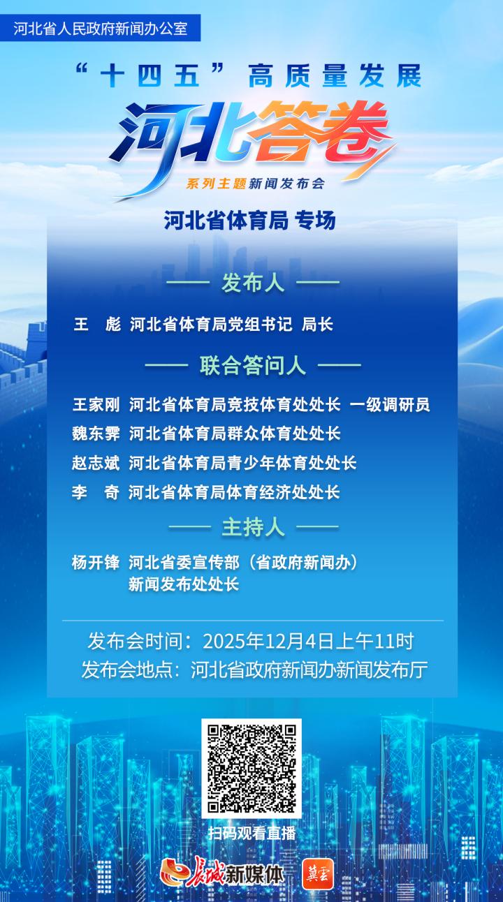 12月4日(星期四)11:00,河北省政府新闻办将举办“十四五”高质量发展河北答卷系列主题新闻发布会,邀请省体育局主要负责同志介绍“十四五”时期河北体育高质量发展情况,并与该单位相关处室主要负责同志共同回答记者提问。
