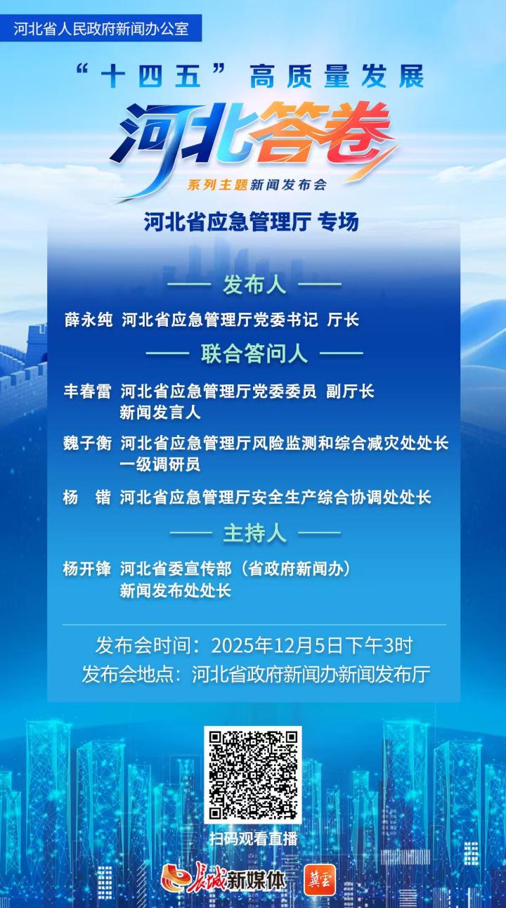 12月5日(星期五)15:00,河北省政府新闻办将举办“十四五”高质量发展河北答卷系列主题新闻发布会,邀请河北省应急管理厅主要负责同志介绍“十四五”时期河北省应急管理事业发展成果,该厅分管负责同志及相关处室主要负责同志共同回答记者提问。