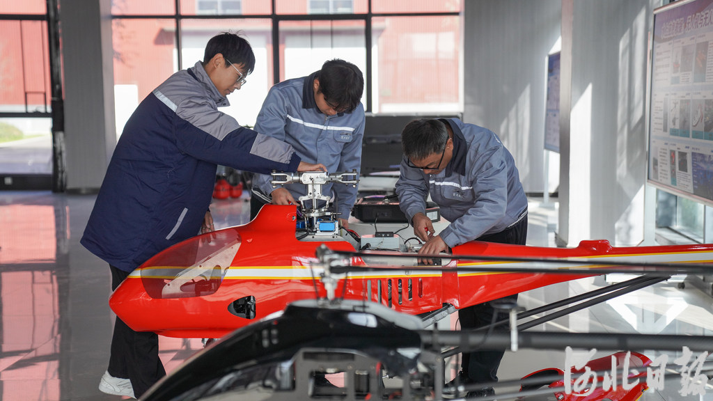 11月27日,在邯郸科创产业园内,河北博柯莱智能装备科技股份有限公司研发团队正与河北空天航空科技有限公司科研人员研讨无人机产品。董源摄