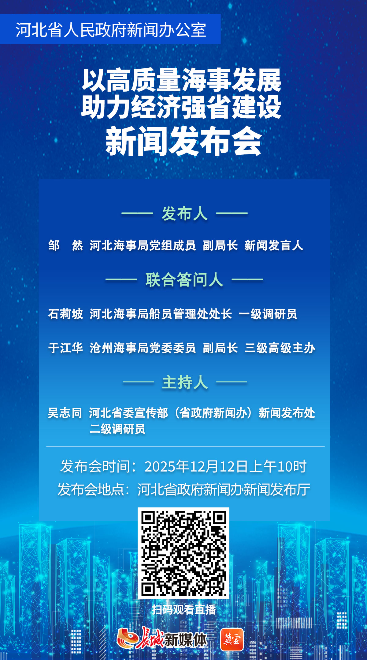 12月12日(星期五)10时,河北省政府新闻办将召开“以高质量海事发展助力经济强省建设”新闻发布会。河北海事局负责同志作主发布,并与该局相关处室及黄骅海事局负责同志共同回答记者提问。