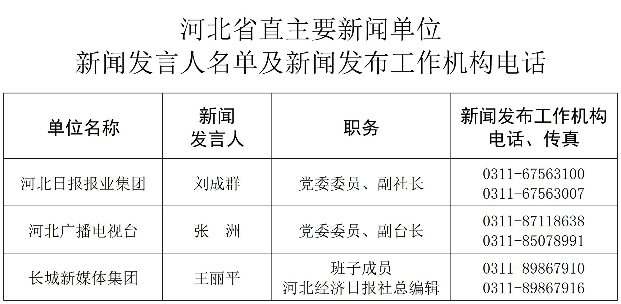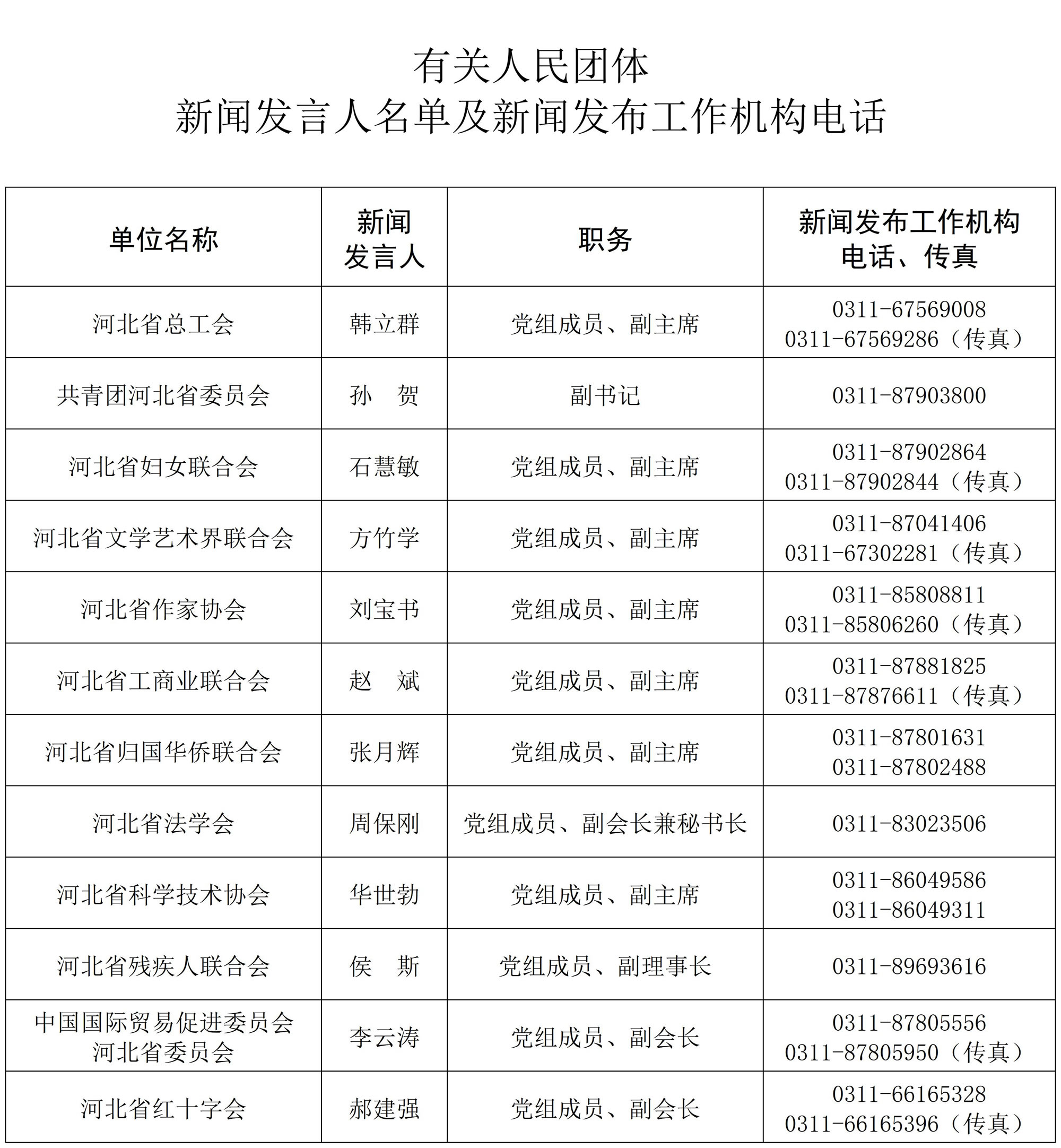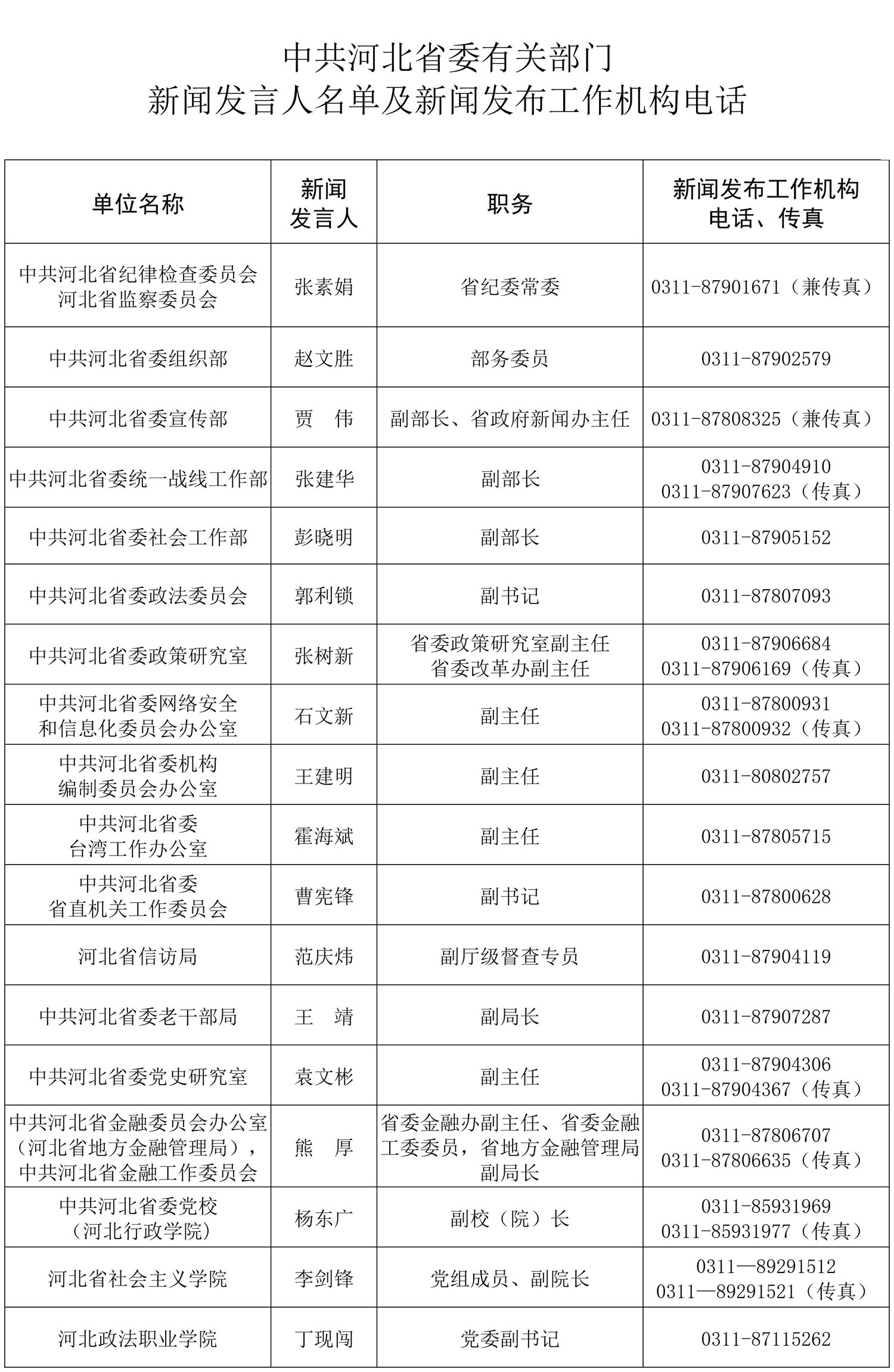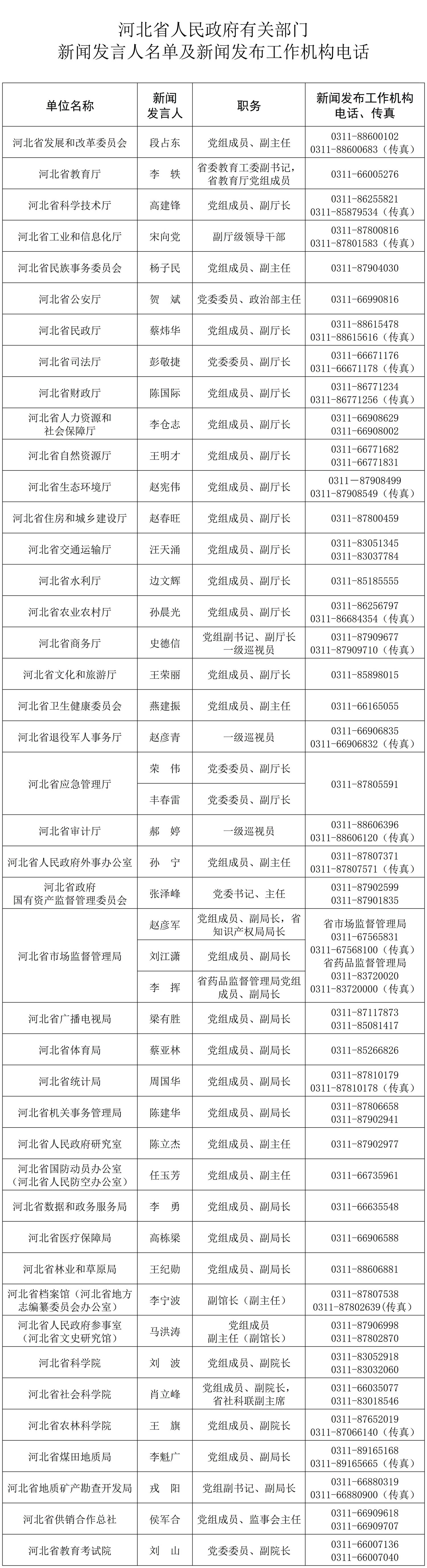 河北省省直单位和群众团体新闻发言人名单及新闻发布机构电话