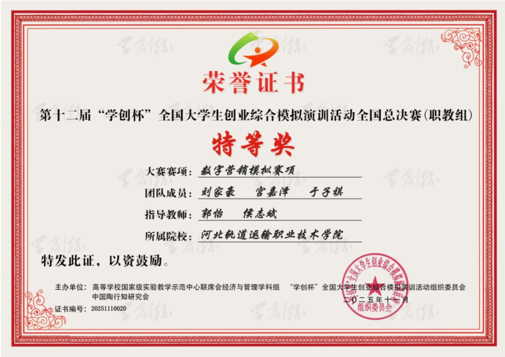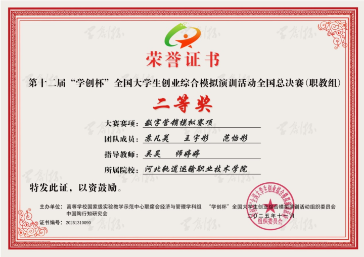 2025年河北轨道运输职业技术学院高度重视创新创业教育,不断完善创新创业教育体系,通过开设创新创业课程、完善学生创新创业设施及场地、举办创客训练营、聘请专家指导等多种举措,为学子们提供了全方位的创新创业支持,组织师生踊跃参与各类国家级、省级创新创业类大赛。在全体参赛师生的共同努力下,河北轨道运输职业技术学院团队在多项赛事中脱颖而出,斩获颇丰,充分展现了学子扎实的专业素养、卓越的创新思维和强劲的创业潜力。