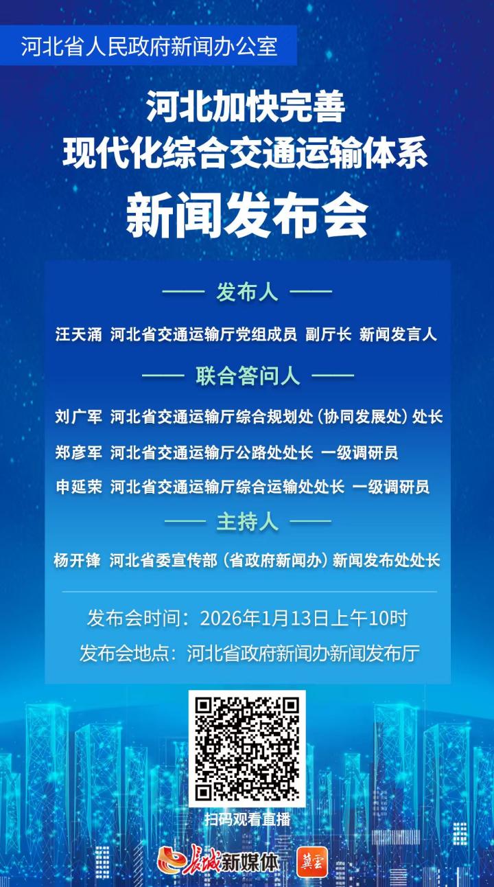 1月13日(星期二)10时,省政府新闻办将召开“河北加快完善现代化综合交通运输体系”新闻发布会。河北省交通运输厅负责同志发布,并与该厅相关处室主要负责同志共同回答记者提问。
